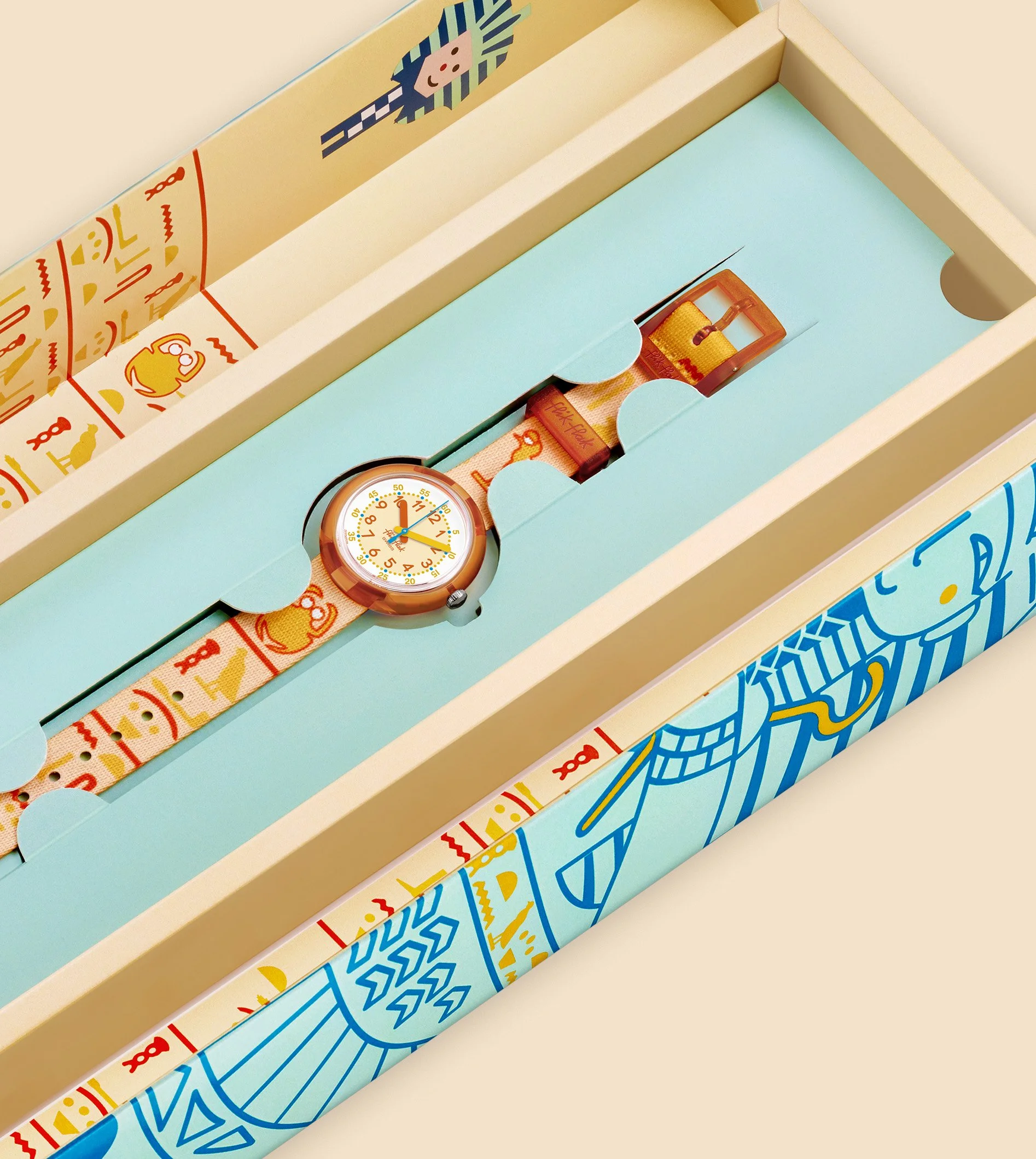 For the collaboration Flik Flak X Le Musée du Louvre, the brand launched two watches and a special packaging with a poster for learning the language of hieroglyphs through riddles.